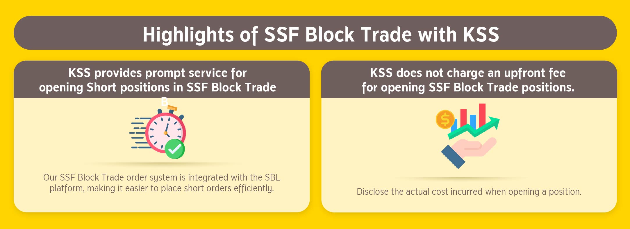 - When investors open SSF Block Trade with KSS, investor must also close those positions with KSS. Closing positions through other brokers or directly on the exchange is not permitted.