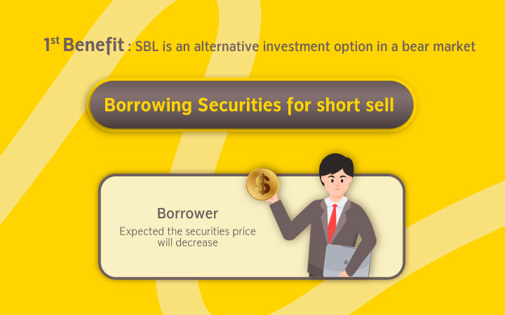 Typically, the investors will look for a chance to buy securities in cheaper price and sell out at the higher price. But when the market is declining, the investors can also find the investment opportunity thru SBL service. They can borrow securities for short selling at higher price and then buy the securities back at cheaper when the market price goes down as expected to return such securities and pay a borrowing fee to the company. The return on investment is the gap between short selling price and buying back price less borrowing fee.
