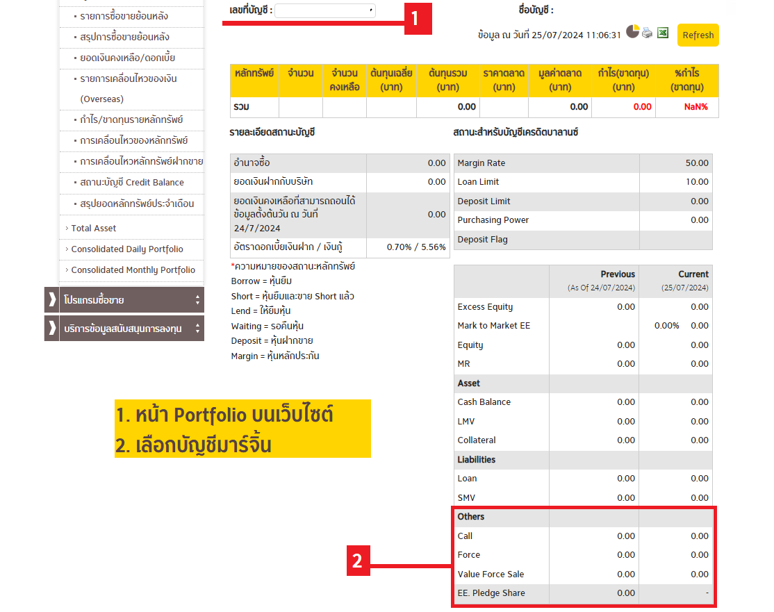 - ถ้าสถานะภาพล่าสุดของบัญชีเป็น Margin Loan (คือมีภาระหนี้) และยอดดอกเบี้ยสุทธิประจำเดือนเป็น “ดอกเบี้ยจ่าย” จะส่งผลให้ลูกค้ามีภาระหนี้ เพิ่มขึ้น ในวันทำการแรกของเดือนถัดไป